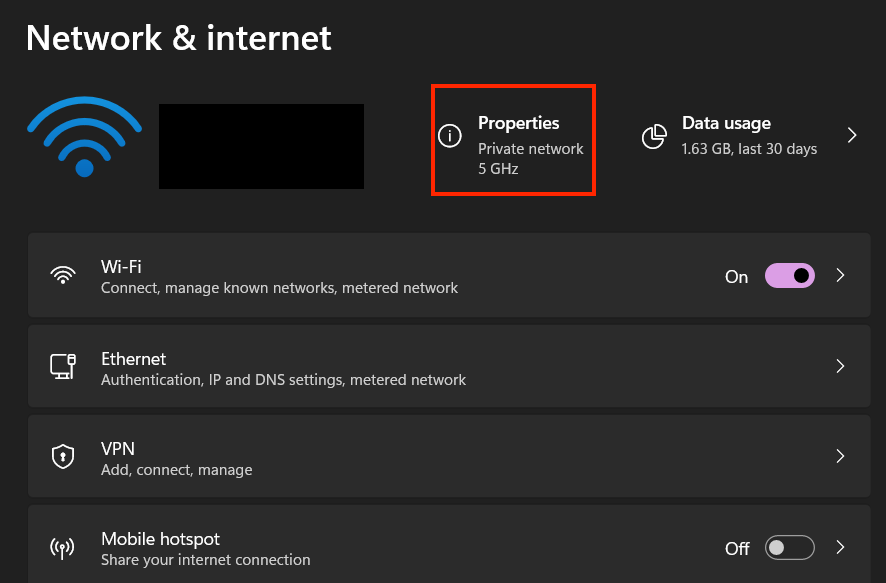 Close the window, go into Settings, and select Network & Internet. Then select Properties.