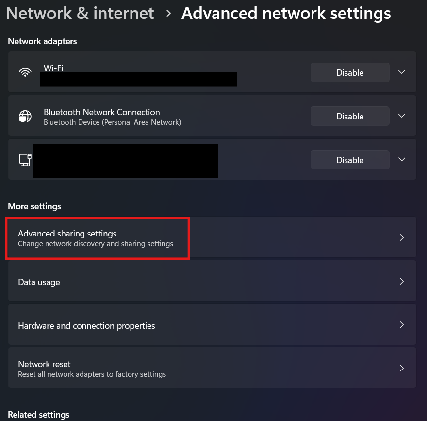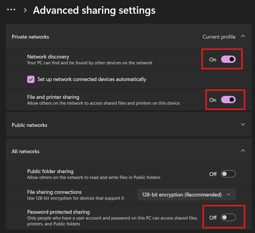 Ensure Network Discovery and File and Printer Sharing are both ON.